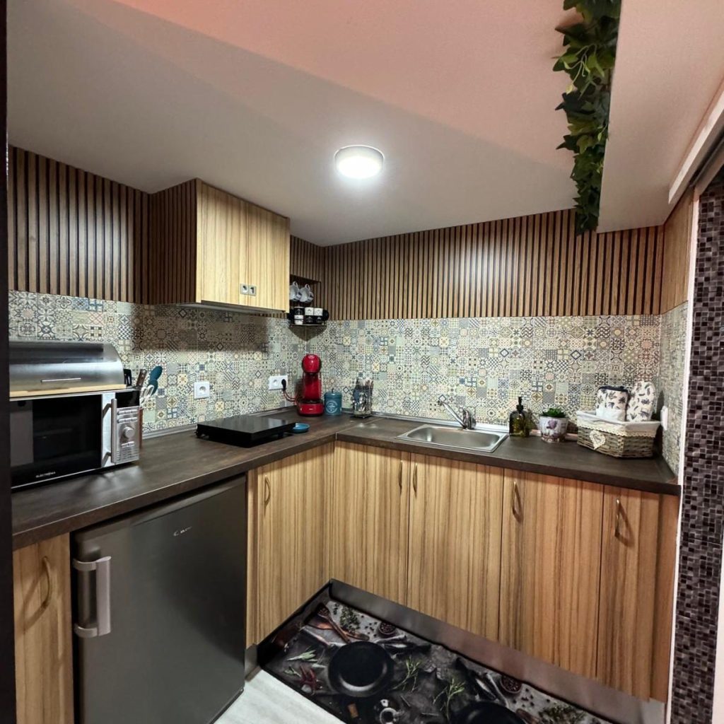 - Cozinha (Kitchnett): Equipada com uma mesa dobrável, frigorífico, placa de indução, forno micro-ondas, torradeira, varinha mágica, chaleira e máquina de café Delta – com água e cápsulas de café de cortesia – e todos os utensílios para preparar e realizar as refeições.